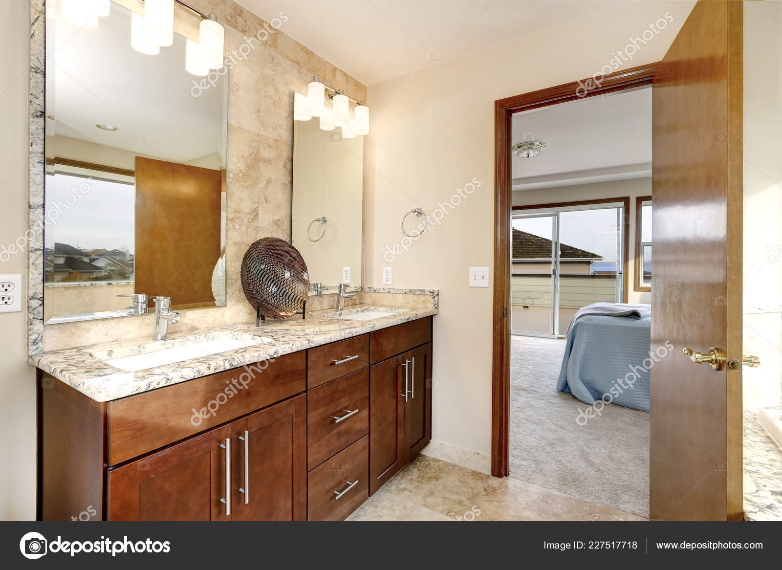 Bathroom Interior Dark Wood Cebinets Two Sinks Mirrors Stock