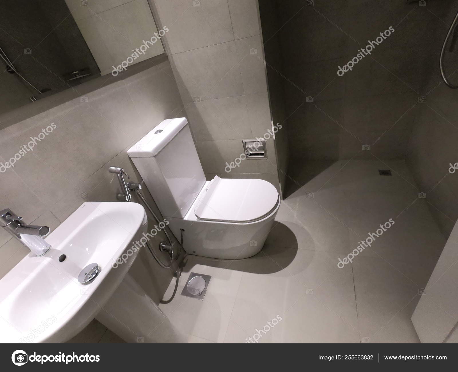 Small Bathroom With Sink Toilet And Shower Area Grey Concrete