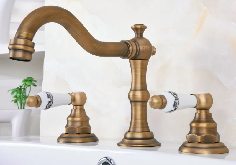 Antique Brass Dual Ceramic Flower Levers Handles Widespread 3 Hole