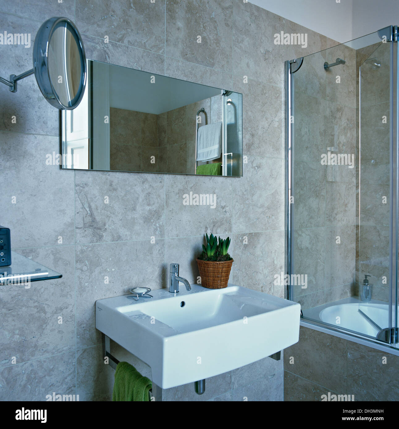 Basket Of Hyacinths On Rectangular Basin Below Oblong Mirror In