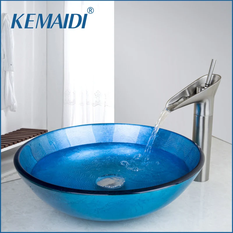 Kemaidi Round Blue Tempered Glass Wash Basin Vessel Sink With