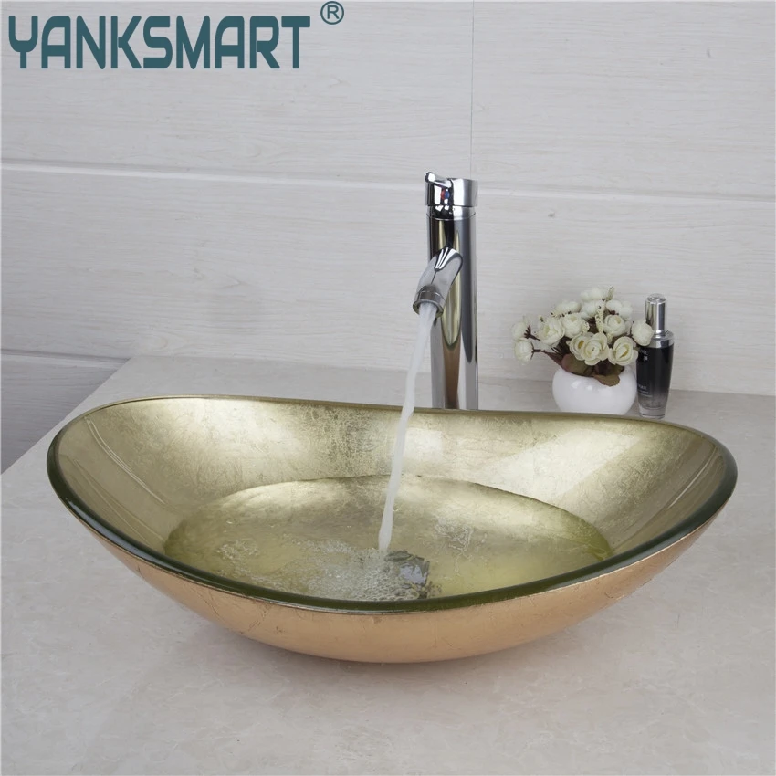Yanksmart Yellow Oval Glass Washroom Basin Vessel Vanity Sink