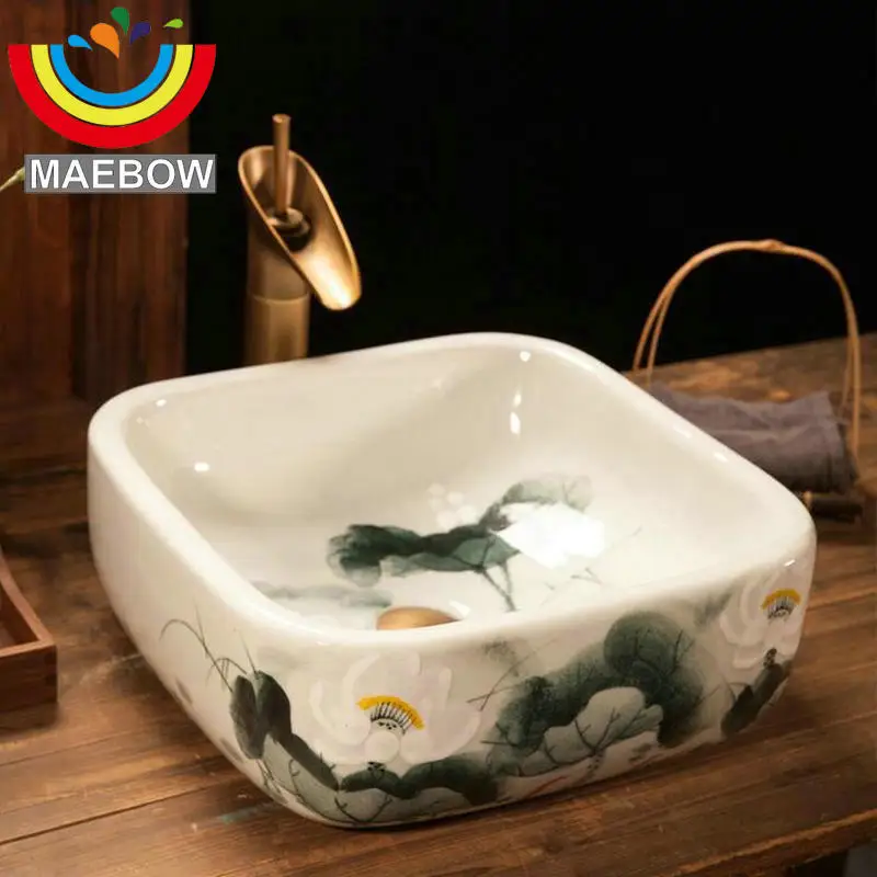 Handpainted Lotus Porcelain Sink Wash Basin Square Countertop