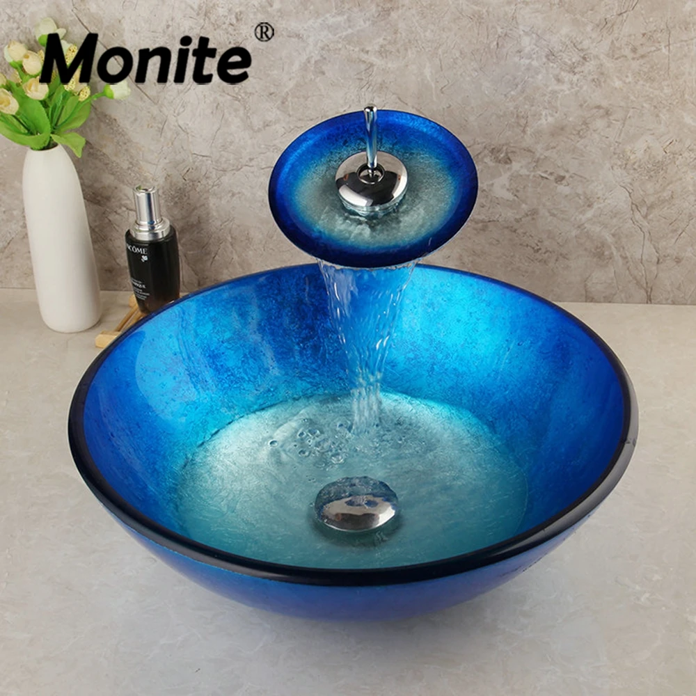 Monite Blue Artist Tempered Glass Bathroom Designer Vessel Sink