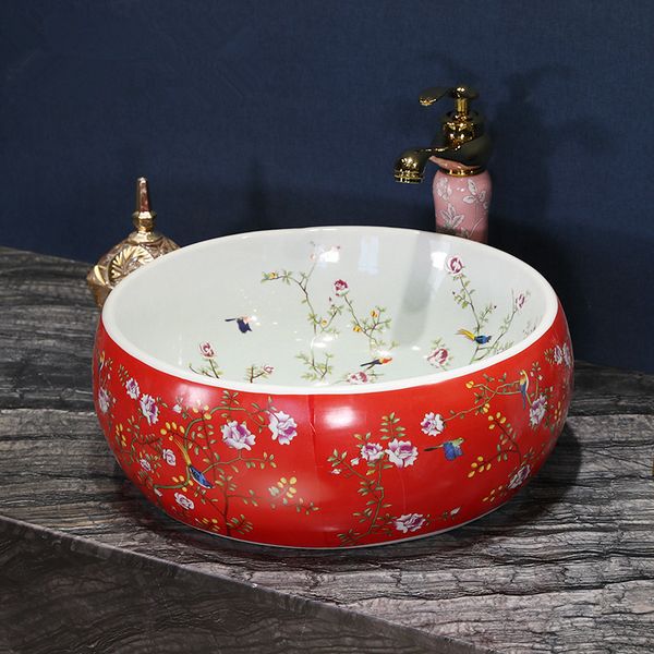 Red Flower And Bird Antique Style Art Ceramic Porcelain Wash Basin
