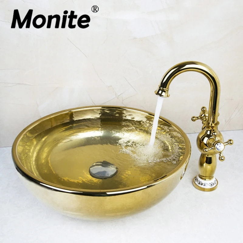 Double Handle Golden Kitchen Swivel Tap Washbasin Luxury Ceramic