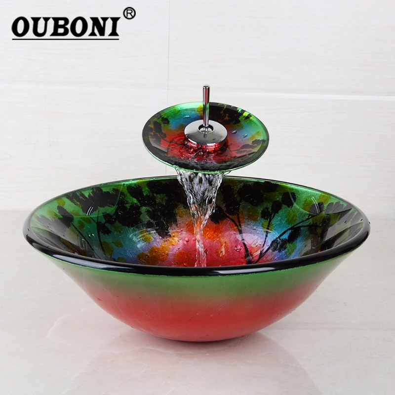 Ouboni Lotus Leaf Art Design Waterfall Tempered Glass Vessel Round
