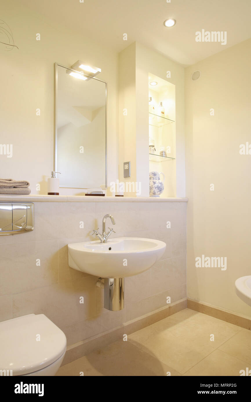 Mirror And Shelf Above Wall Mounted Washbasin In Contemporary