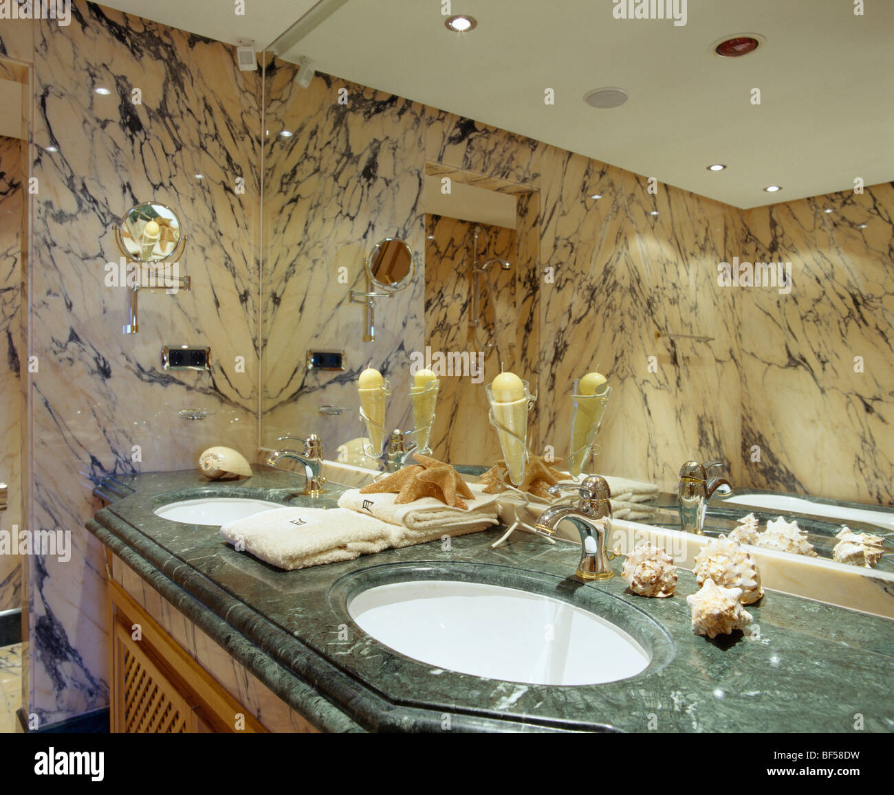 Mirrored Wall Above Under Set Basins In Green Marble Vanity Unit
