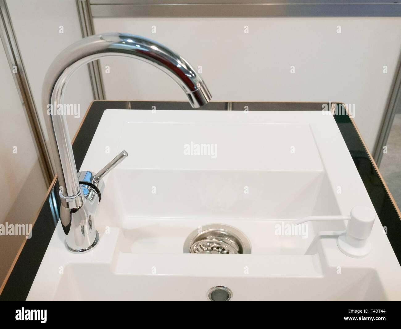 Closeup Of Modern Square Kitchen Sink With Two Faucets Stock Photo