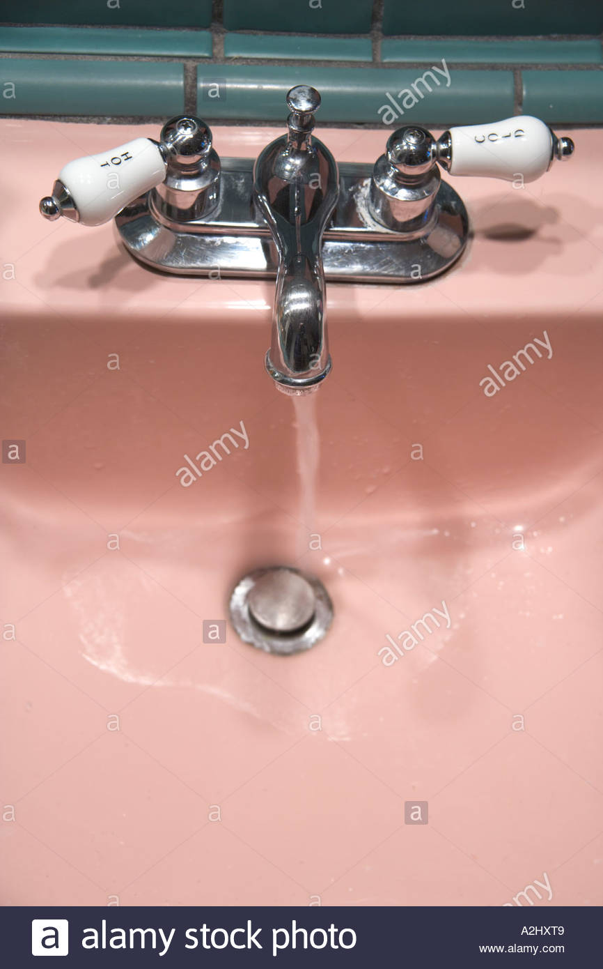 Soap And Oldfashioned Taps On Pink Bathroom Sink High Res Stock